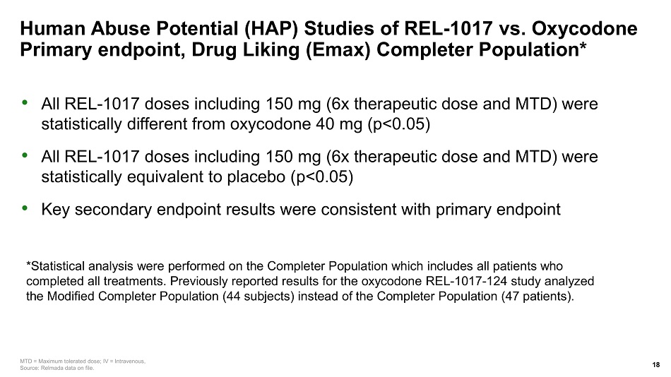 Primary Endpoint – “Drug Liking at This Moment” [Emax] REL - 1017 vs. Oxycodone, Completer Population* Treatment 1 Treatment 2 P - value Oxycodone 40 mg Placebo <0.001 Oxycodone 40 mg REL - 1017 25 mg <0.001 Oxycodone 40 mg REL - 1017 75 mg <0.001 Oxycodone 40 mg REL - 1017 150 mg <0.001 Statistical Analysis SD = Standard Deviation; SE = Standard Error Source: Relmada data on file. All REL - 1017 doses are statistically equivalent to placebo (p<0.05) * Previously reported results for the oxycodone REL - 1017 - 124 study analyzed the Modified Completer Population (44 subjects) instead of the Completer Population (47 patients) 17 Treatment 1 Treatment 2 P - value REL - 1017 25 mg Placebo <0.001 REL - 1017 75 mg Placebo <0.001 REL - 1017 150 mg Placebo <0.05 REL - 1017 vs. Oxycodone All REL - 1017 doses are statistically different from oxycodone (p<.05) REL - 1017 vs. Placebo