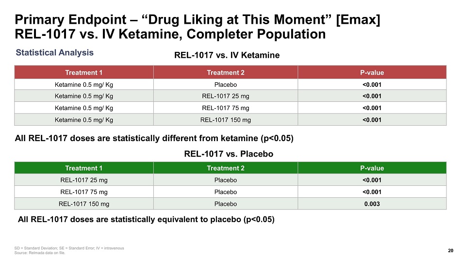 Primary Endpoint – “Drug Liking at This Moment” [Emax] REL - 1017 vs. IV Ketamine, Completer Population Statistic Parameter Placebo REL - 1017 25 mg REL - 1017 75 mg REL - 1017 150 mg Dextromethorphan 300 mg Ketamine 0.5mg/Kg n 51 51 51 51 51 51 Mean 50.9 51.4 54.9 59.2 68.4 90 Median 50 50 50 51 60 100 SD 2.23 3.28 9.58 14.38 18.39 14.52 SE 0.31 0.46 1.34 2.01 2.57 2.03 SD = Standard Deviation; SE = Standard Error; IV = intravenous Source: Relmada data on file. Consistent results were seen for the secondary endpoints 19