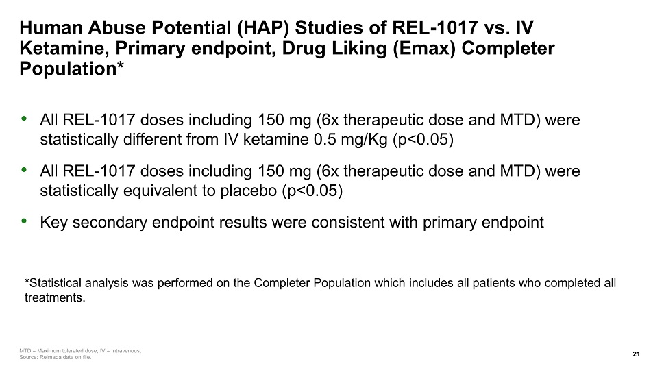 Primary Endpoint – “Drug Liking at This Moment” [Emax] REL - 1017 vs. IV Ketamine, Completer Population Treatment 1 Treatment 2 P - value Ketamine 0.5 mg/ Kg Placebo <0.001 Ketamine 0.5 mg/ Kg REL - 1017 25 mg <0.001 Ketamine 0.5 mg/ Kg REL - 1017 75 mg <0.001 Ketamine 0.5 mg/ Kg REL - 1017 150 mg <0.001 Statistical Analysis SD = Standard Deviation; SE = Standard Error; IV = intravenous Source: Relmada data on file. All REL - 1017 doses are statistically equivalent to placebo (p<0.05) 20 Treatment 1 Treatment 2 P - value REL - 1017 25 mg Placebo <0.001 REL - 1017 75 mg Placebo <0.001 REL - 1017 150 mg Placebo 0.003 REL - 1017 vs. IV Ketamine All REL - 1017 doses are statistically different from ketamine (p<0.05) REL - 1017 vs. Placebo