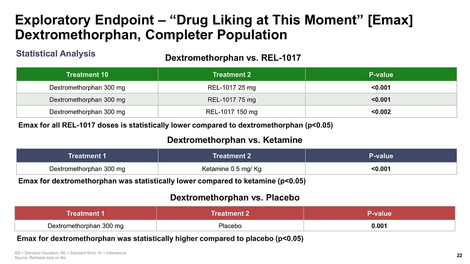 Human Abuse Potential (HAP) Studies of REL - 1017 vs. IV Ketamine, Primary endpoint, Drug Liking (Emax) Completer Population* • All REL - 1017 doses including 150 mg (6x therapeutic dose and MTD) were statistically different from IV ketamine 0.5 mg/Kg (p<0.05) • All REL - 1017 doses including 150 mg (6x therapeutic dose and MTD) were statistically equivalent to placebo (p<0.05) • Key secondary endpoint results were consistent with primary endpoint 21 MTD = Maximum tolerated dose; IV = Intravenous, Source: Relmada data on file. *Statistical analysis was performed on the Completer Population which includes all patients who completed all treatments.
