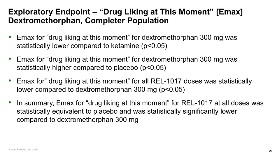 Exploratory Endpoint – “Drug Liking at This Moment” [Emax] Dextromethorphan, Completer Population Treatment 1 Treatment 2 P - value Dextromethorphan 300 mg Placebo 0.001 Statistical Analysis SD = Standard Deviation; SE = Standard Error; IV = intravenous Source: Relmada data on file. 22 Dextromethorphan vs. REL - 1017 Treatment 1 Treatment 2 P - value Dextromethorphan 300 mg Ketamine 0.5 mg/ Kg <0.001 Treatment 10 Treatment 2 P - value Dextromethorphan 300 mg REL - 1017 25 mg <0.001 Dextromethorphan 300 mg REL - 1017 75 mg <0.001 Dextromethorphan 300 mg REL - 1017 150 mg <0.002 Emax for all REL - 1017 doses is statistically lower compared to dextromethorphan (p<0.05) Dextromethorphan vs. Ketamine Emax for dextromethorphan was statistically lower compared to ketamine (p<0.05) Dextromethorphan vs. Placebo Emax for dextromethorphan was statistically higher compared to placebo (p<0.05)