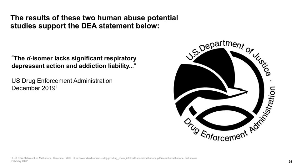 The results of these two human abuse potential studies support the DEA statement below: 24 “ The d - isomer lacks significant respiratory depressant action and addiction liability.. .” US Drug Enforcement Administration December 2019 1 1.US DEA Statement on Methadone, December 2019 https:// www.deadiversion.usdoj.gov/drug_chem_info/methadone/methadone.pdf#search=methadone last access February 2022