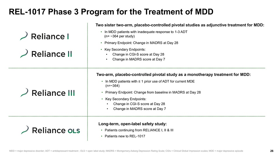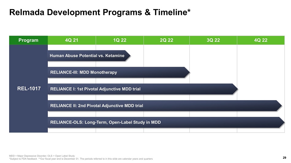 Screening confirms ≤ 1 prior use of ADT for current MDE 25 mg REL - 1017 Matching Placebo Pivotal Phase 3 Trial Design for Monotherapy 28 Primary Endpoint: • Change in MADRS at Day 28 Key Secondary Endpoints: • Change from baseline in CGI - S score at Day 28 • Change from baseline in MADRS score at Day 7 1:1 randomization (n= ~364) 28 Days of Dosing (QD) Follow - Up Assessments & RELIANCE - OLS SAFER Interview* D 1 Start Dosing** D 4 D 7 D 14 D 28 End of Treatment D 21 MADRS = Montgomery - Asberg Depression Rating Scale; CGIs = Clinical Global Impression scales; MDE = major depressive episode; ADT = antidepressant treatment; QD = once daily; OLS = open label study *SAFER interview confirms that the illness is a specific state and excludes patients with any symptoms that are nonspecific or not readily assessable. Desseilles M, et al 2013. Massachusetts General Hospital SAFER criteria for clinical trials and research. Harv Rev Psychiatry. Sep - Oct;21(5):269 - 74. **75mg loading dose on Day 1 of REL - 1017