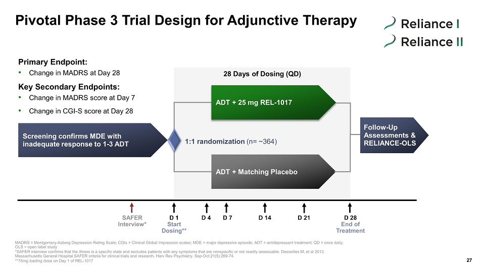 REL - 1017 Phase 3 Program for the Treatment of MDD 26 Two sister two - arm, placebo - controlled pivotal studies as adjunctive treatment for MDD: • In MDD patients with inadequate response to 1 - 3 ADT (n= ~364 per study) • Primary Endpoint: Change in MADRS at Day 28 • Key Secondary Endpoints: • Change in CGI - S score at Day 28 • Change in MADRS score at Day 7 Two - arm, placebo - controlled pivotal study as a monotherapy treatment for MDD: • In MDD patients with ≤ 1 prior use of ADT for current MDE (n=~364) • Primary Endpoint: Change from baseline in MADRS at Day 28 • Key Secondary Endpoints: • Change in CGI - S score at Day 28 • Change in MADRS score at Day 7 Long - term, open - label safety study: • Patients continuing from RELIANCE I, II & III • Patients new to REL - 1017 MDD = major depressive disorder; ADT = antidepressant treatment ; OLS = open label study; MADRS = Montgomery - Asberg Depression Rating Scale; CGIs = Clinical Global Impression scales; MDE = major depressive episode