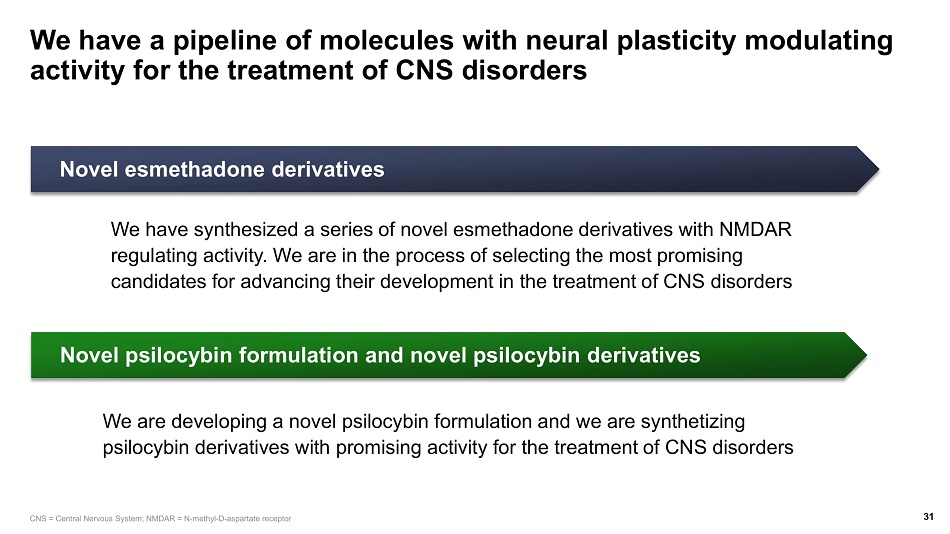 We have a pipeline of molecules with neural plasticity modulating activity for the treatment of CNS disorders 31 We are developing a novel psilocybin formulation and we are synthetizing psilocybin derivatives with promising activity for the treatment of CNS disorders We have synthesized a series of novel esmethadone derivatives with NMDAR regulating activity. We are in the process of selecting the most promising candidates for advancing their development in the treatment of CNS disorders Novel esmethadone derivatives Novel psilocybin formulation and novel psilocybin derivatives CNS = Central Nervous System; NMDAR = N - methyl - D - aspartate receptor