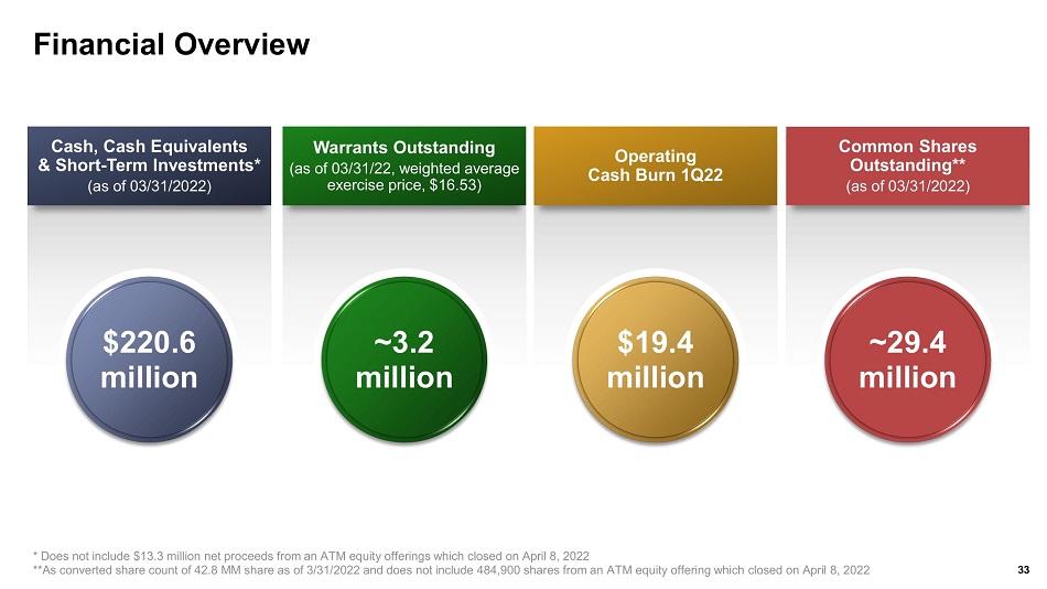 Financial Overview Cash, Cash Equivalents & Short - Term Investments* (as of 03/31/2022) $220.6 million Warrants Outstanding (as of 03/31/22, weighted average exercise price, $16.53) ~3.2 million Operating Cash Burn 1Q22 $19.4 million Common Shares Outstanding** (as of 03/31/2022) ~29.4 million 33 * Does not include $13.3 million net proceeds from an ATM equity offerings which closed on April 8, 2022 **As converted share count of 42.8 MM share as of 3/31/2022 and does not include 484,900 shares from an ATM equity offering which closed on April 8, 2022