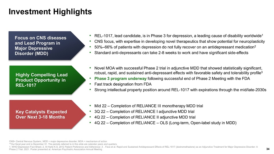 Investment Highlights Highly Compelling Lead Product Opportunity in REL - 1017 Key Catalysts Expected Over Next 3 - 18 Months Focus on CNS diseases and Lead Program in Major Depressive Disorder (MDD) CNS= Central Nervous System;; MDD = major depressive disorder; MOA = mechanism of action **Our fiscal year end is December 31. The periods referred to in this slide are calendar years and quarters. 1. WHO Depression Fact Sheet; 2. Al - Harbi K.S. 2012 Patient Preference and Adherence; 3. . Fava et al. Rapid and Sustained Antidepressant Effects of REL - 1017 (dextromethadone) as an Adjunctive Treatment for Major Depressive Disorder: A Phase 2 Trial. 2021. Poster presented at: American Psychiatric Association Annual Meeting 34 • Novel MOA with successful Phase 2 trial in adjunctive MDD that showed statistically significant, robust, rapid, and sustained anti - depressant effects with favorable safety and tolerability profile 3 • Phase 3 program underway following successful end of Phase 2 Meeting with the FDA • Fast track designation from FDA • Strong intellectual property position around REL - 1017 with expirations through the mid/late - 2030s • REL - 1017, lead candidate, is in Phase 3 for depression, a leading cause of disability worldwide 1 • CNS focus, with expertise in developing novel therapeutics that show potential for neuroplasticity • 50% – 66% of patients with depression do not fully recover on an antidepressant medication 2 • Standard anti - depressants can take 2 - 8 weeks to work and have significant side - effects • Mid 22 – Completion of RELIANCE III monotherapy MDD trial • 3Q 22 – Completion of RELIANCE I adjunctive MDD trial • 4Q 22 – Completion of RELIANCE II adjunctive MDD trial • 4Q 22 – Completion of RELIANCE – OLS (Long - term, Open - label study in MDD)
