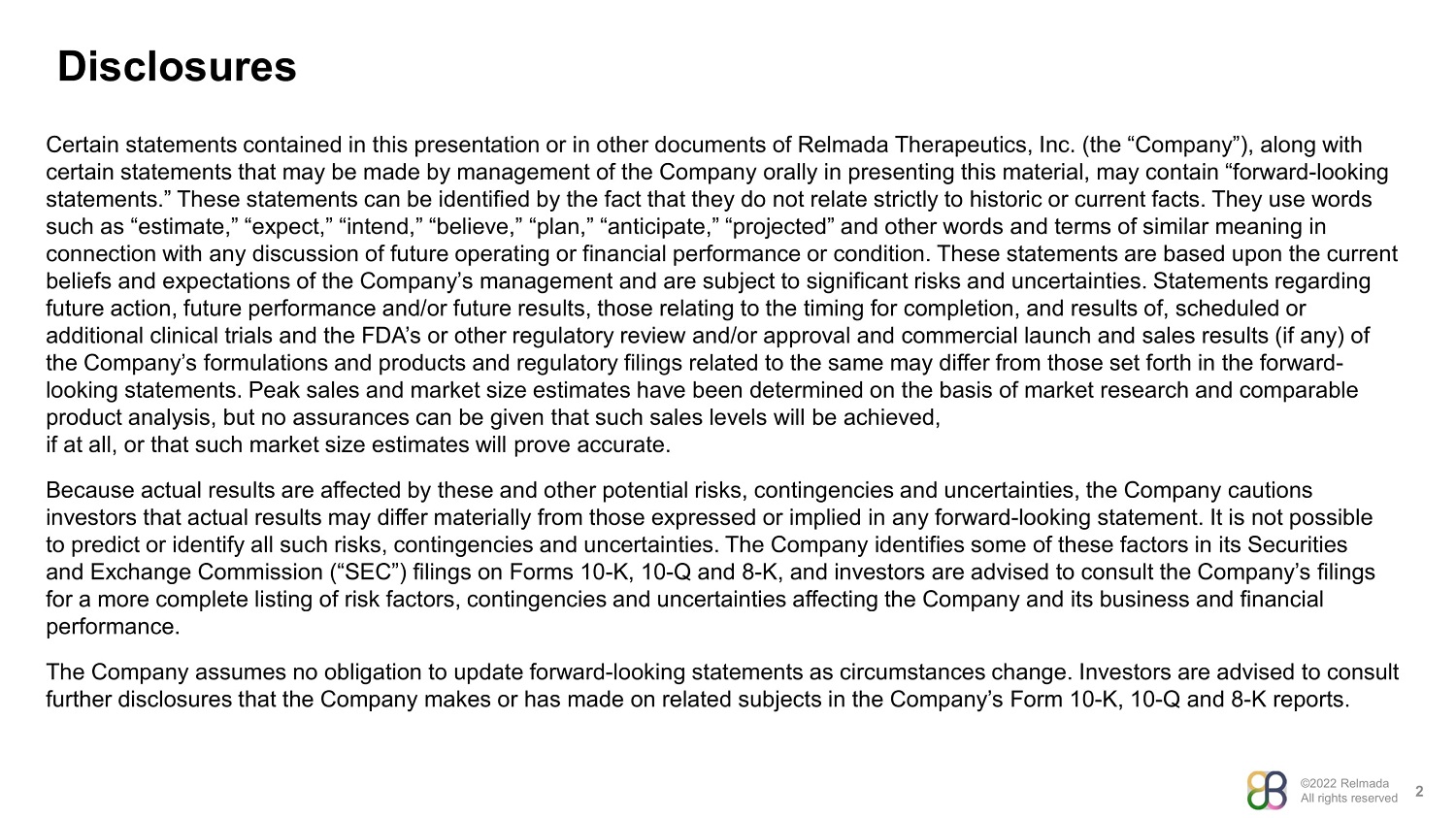 ©2022 Relmada All rights reserved Disclosures Certain statements contained in this presentation or in other documents of Relmada Therapeutics, Inc. (the “Company”), along with certain statements that may be made by management of the Company orally in presenting this material, may contain “forward - looking statements.” These statements can be identified by the fact that they do not relate strictly to historic or current facts. They use words such as “estimate,” “expect,” “intend,” “believe,” “plan,” “anticipate,” “projected” and other words and terms of similar meaning in connection with any discussion of future operating or financial performance or condition. These statements are based upon the current beliefs and expectations of the Company’s management and are subject to significant risks and uncertainties. Statements regarding future action, future performance and/or future results, those relating to the timing for completion, and results of, scheduled or additional clinical trials and the FDA’s or other regulatory review and/or approval and commercial launch and sales results (if any) of the Company’s formulations and products and regulatory filings related to the same may differ from those set forth in the forward - looking statements. Peak sales and market size estimates have been determined on the basis of market research and comparable product analysis, but no assurances can be given that such sales levels will be achieved, if at all, or that such market size estimates will prove accurate. Because actual results are affected by these and other potential risks, contingencies and uncertainties, the Company cautions investors that actual results may differ materially from those expressed or implied in any forward - looking statement. It is not possible to predict or identify all such risks, contingencies and uncertainties. The Company identifies some of these factors in its Securities and Exchange Commission (“SEC”) filings on Forms 10 - K, 10 - Q and 8 - K, and investors are advised to consult the Company’s filings for a more complete listing of risk factors, contingencies and uncertainties affecting the Company and its business and financial performance. The Company assumes no obligation to update forward - looking statements as circumstances change. Investors are advised to consult further disclosures that the Company makes or has made on related subjects in the Company’s Form 10 - K, 10 - Q and 8 - K reports. 2