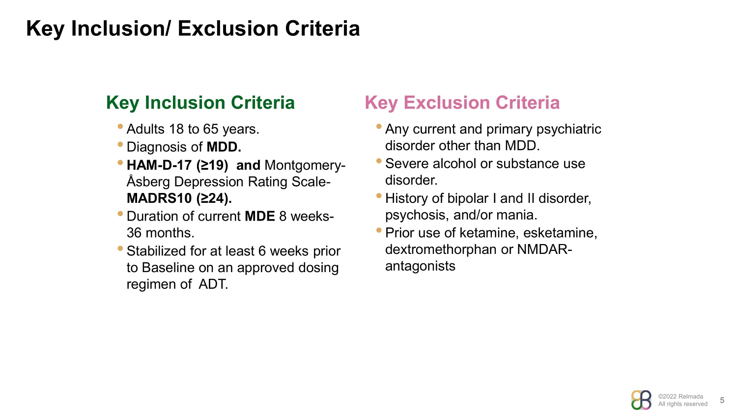 ©2022 Relmada All rights reserved Phase 3 trial (Reliance I) was designed to assess efficacy and safety of REL - 1017 as treatment for MDD in subjects with inadequate response to ongoing antidepressant treatment 4 ADT=antidepressant treatment; CGI - S=Clinical Global Impression – Severity of Illness; MADRS=Montgomery - Asberg Depression Rating Scale; MDE=major depressive episode; OLS=open - label study; QD=once daily *SAFER interview confirms that the illness is a specific state and excludes patients with any symptoms that are nonspecific or not readily assessable Desseilles M, et al. Harv Rev Psychiatry . 2013;21(5):269 - 274. Screening confirms MDE with inadequate response to 1 to 3 ADTs ADT + 25 mg REL - 1017 ADT + matching placebo 1:1 randomization (n=227) 28 Days of Dosing (QD) Follow - up assessments & Reliance - OLS SAFER D 1 D 4 D 7 D 14 D 21 D 28 D 42 Interview* Start dosing End of treatment End of Follow - Up Primary Endpoint: • Change in MADRS at Day 28 Key Secondary Endpoints: • Change in CGI - S score at Day 28 • Change in MADRS score at Day 7 • MADRS10 remission rate at Day 28 • MADRS10 response rate at Day 28 Reliance - OLS