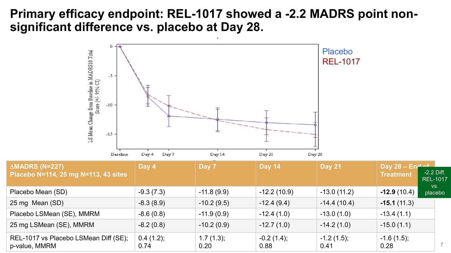 ©2022 Relmada Demographics 6 Characteristics Placebo (N=114) REL - 1017 25 mg (N=113) All patients (N=227) Mean SD Mean SD Mean SD Age (years) 43.6 14.2 43.3 15.1 43.5 14.6 Body Mass Index 26.3 3.3 25.8 2.8 26.0 3.0 N % N % N % Sex Male 27 23.7 31 27.4 58 25.6 Female 87 76.3 82 72.6 169 74.4 Ethnicity Hispanic or Latino 23 20.2 29 25.7 52 22.9 Not Hispanic or Latino 85 74.6 79 69.9 164 72.2 Not reported 6 5.3 3 2.7 9 4.0 Unknown 0 0.0 2 1.8 2 0.9 Race Asian 7 6.1 6 5.3 13 5.7 Black or African American 14 12.3 16 14.2 30 13.2 Caucasian 90 78.9 85 75.2 175 77.1 Multiracial 2 1.8 4 3.5 6 2.6 Other 1 0.9 2 1.8 3 1.3 All rights reserved