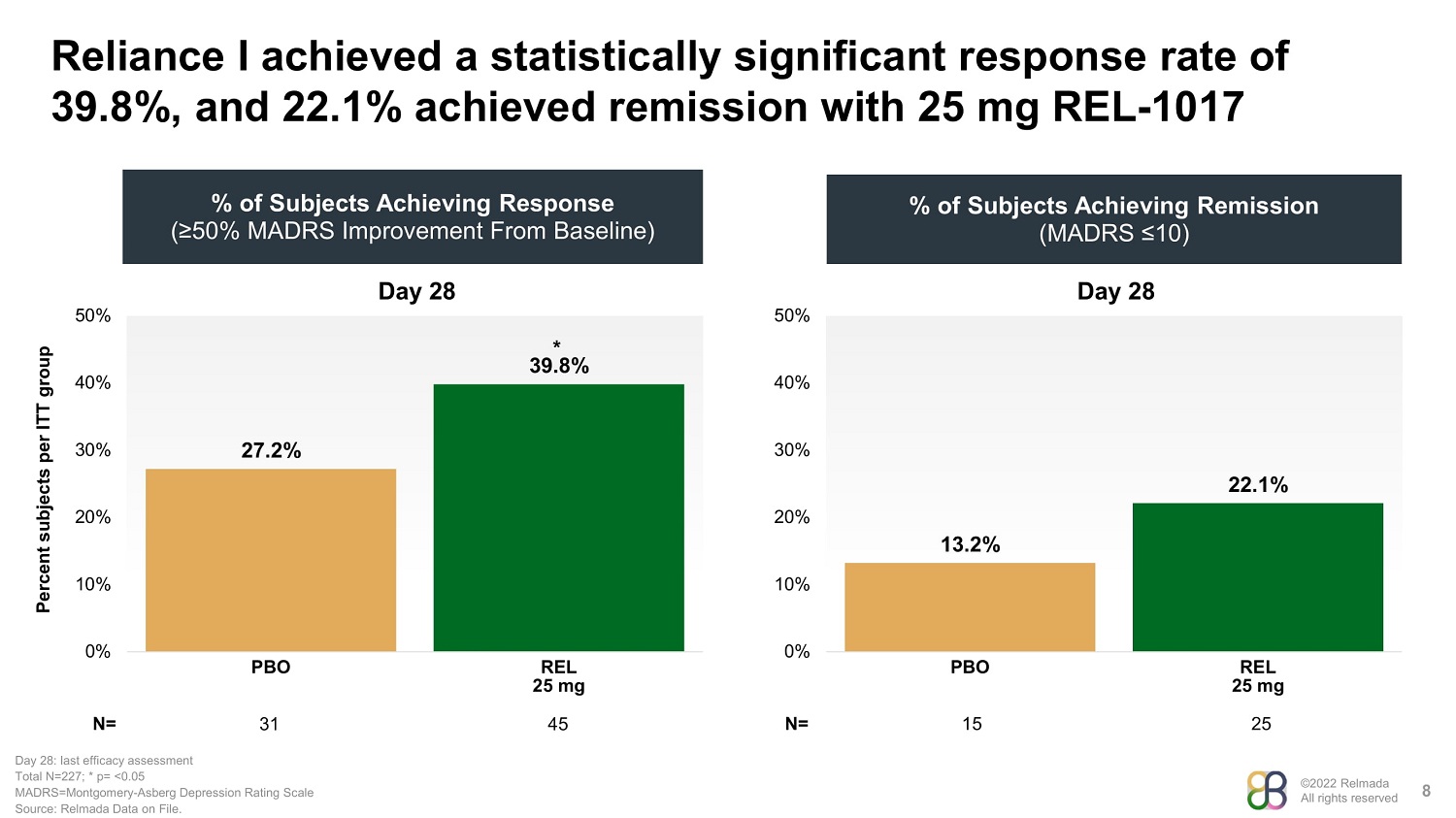 ©2022 Relmada All rights reserved Primary efficacy endpoint: REL - 1017 showed a - 2.2 MADRS point non - significant difference vs. placebo at Day 28. 7 MADRS (N=227) Placebo N=114, 25 mg N=113, 43 sites Day 4 Day 7 Day 14 Day 21 Day 28 – End of Treatment - 2.2 REL - vs Placebo Mean (SD) - 9.3 (7.3) - 11.8 (9.9) - 12.2 (10.9) - 13.0 (11.2) - 12.9 (10.4) plac 25 mg Mean (SD) - 8.3 (8.9) - 10.2 (9.5) - 12.4 (9.4) - 14.4 (10.4) - 15.1 (11.3) Placebo LSMean (SE), MMRM - 8.6 (0.8) - 11.9 (0.9) - 12.4 (1.0) - 13.0 (1.0) - 13.4 (1.1) 25 mg LSMean (SE), MMRM - 8.2 (0.8) - 10.2 (0.9) - 12.7 (1.0) - 14.2 (1.0) - 15.0 (1.1) REL - 1017 vs Placebo LSMean Diff (SE); p - value, MMRM 0.4 (1.2); 0.74 1.7 (1.3); 0.20 - 0.2 (1.4); 0.88 - 1.2 (1.5); 0.41 - 1.6 (1.5); 0.28 Diff. 1017 . ebo Placebo REL - 1017