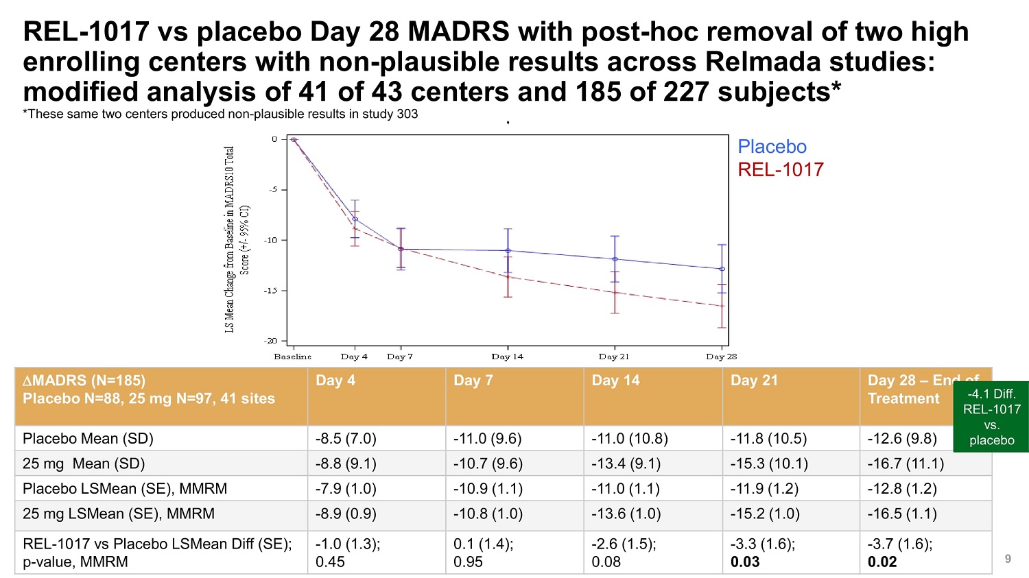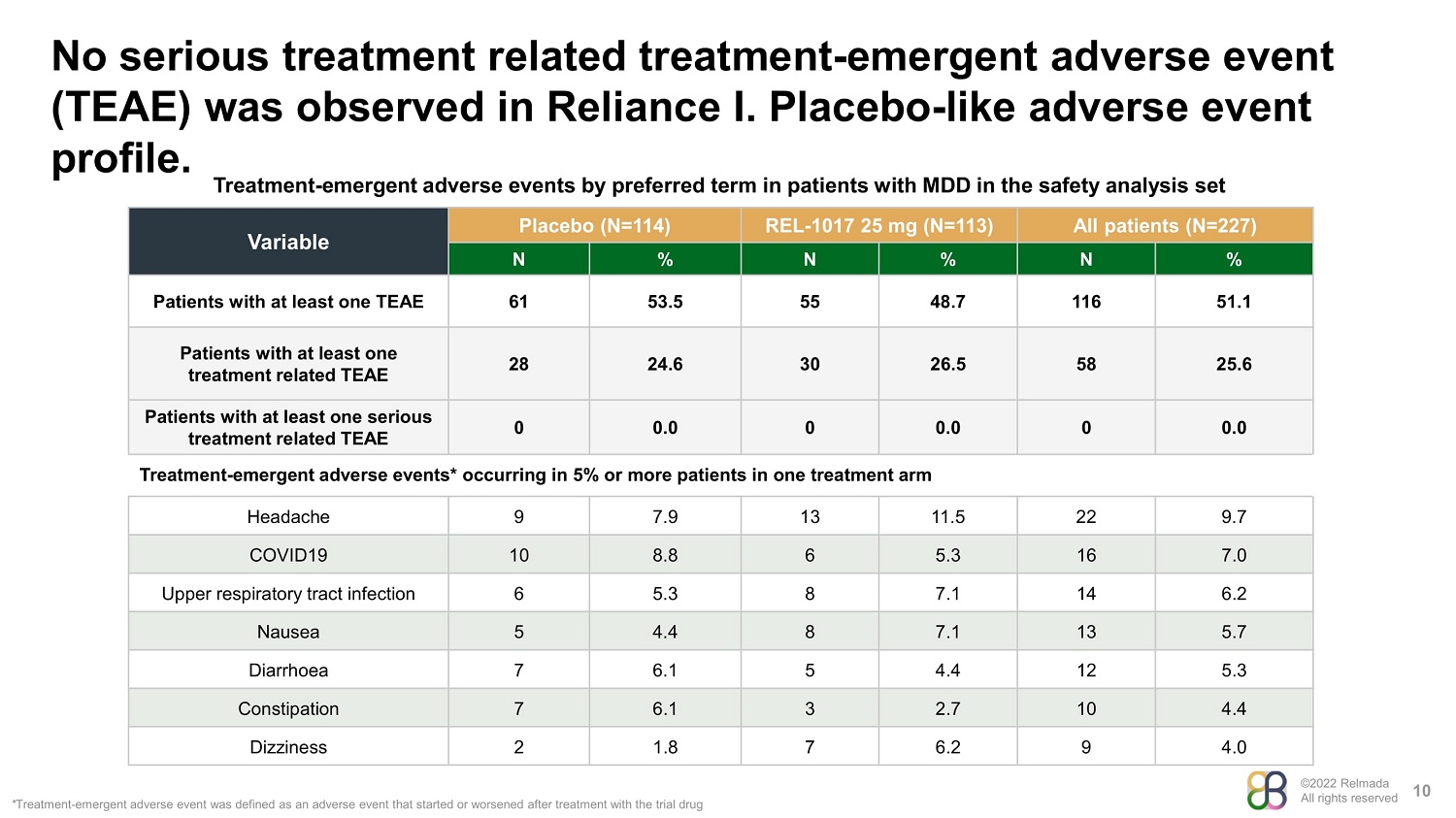 ©2022 Relmada All rights reserved REL - 1017 vs placebo Day 28 MADRS with post - hoc removal of two high enrolling centers with non - plausible results across Relmada studies: modified analysis of 41 of 43 centers and 185 of 227 subjects* *These same two centers produced non - plausible results in study 303 9 MADRS (N=185) Placebo N=88, 25 mg N=97, 41 sites Day 4 Day 7 Day 14 Day 21 Day 28 – End of Treatment - 4.1 REL - vs Placebo Mean (SD) - 8.5 (7.0) - 11.0 (9.6) - 11.0 (10.8) - 11.8 (10.5) - 12.6 (9.8) plac 25 mg Mean (SD) - 8.8 (9.1) - 10.7 (9.6) - 13.4 (9.1) - 15.3 (10.1) - 16.7 (11.1) Placebo LSMean (SE), MMRM - 7.9 (1.0) - 10.9 (1.1) - 11.0 (1.1) - 11.9 (1.2) - 12.8 (1.2) 25 mg LSMean (SE), MMRM - 8.9 (0.9) - 10.8 (1.0) - 13.6 (1.0) - 15.2 (1.0) - 16.5 (1.1) REL - 1017 vs Placebo LSMean Diff (SE); p - value, MMRM - 1.0 (1.3); 0.45 0.1 (1.4); 0.95 - 2.6 (1.5); 0.08 - 3.3 (1.6); 0.03 - 3.7 (1.6); 0.02 Diff. 1017 . ebo Placebo REL - 1017
