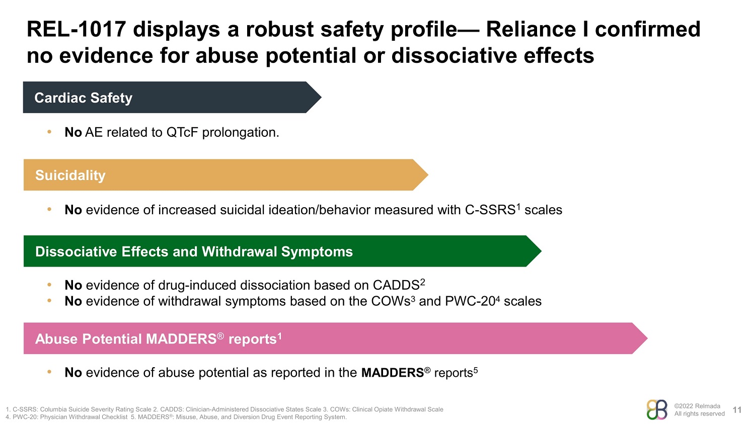 ©2022 Relmada All rights reserved No serious treatment related treatment - emergent adverse event (TEAE) was observed in Reliance I. Placebo - like adverse event profile. 10 Treatment - emergent adverse events by preferred term in patients with MDD in the safety analysis set Variable Placebo (N=114) REL - 1017 25 mg (N=113) All patients (N=227) N % N % N % Patients with at least one TEAE 61 53.5 55 48.7 116 51.1 Patients with at least one treatment related TEAE 28 24.6 30 26.5 58 25.6 Patients with at least one serious treatment related TEAE 0 0.0 0 0.0 0 0.0 Treatment - emergent adverse events* occurring in 5% or more patients in one treatment arm Headache 9 7.9 13 11.5 22 9.7 COVID19 10 8.8 6 5.3 16 7.0 Upper respiratory tract infection 6 5.3 8 7.1 14 6.2 Nausea 5 4.4 8 7.1 13 5.7 Diarrhoea 7 6.1 5 4.4 12 5.3 Constipation 7 6.1 3 2.7 10 4.4 Dizziness 2 1.8 7 6.2 9 4.0 * Treatment - emergent adverse event was defined as an adverse event that started or worsened after treatment with the trial drug