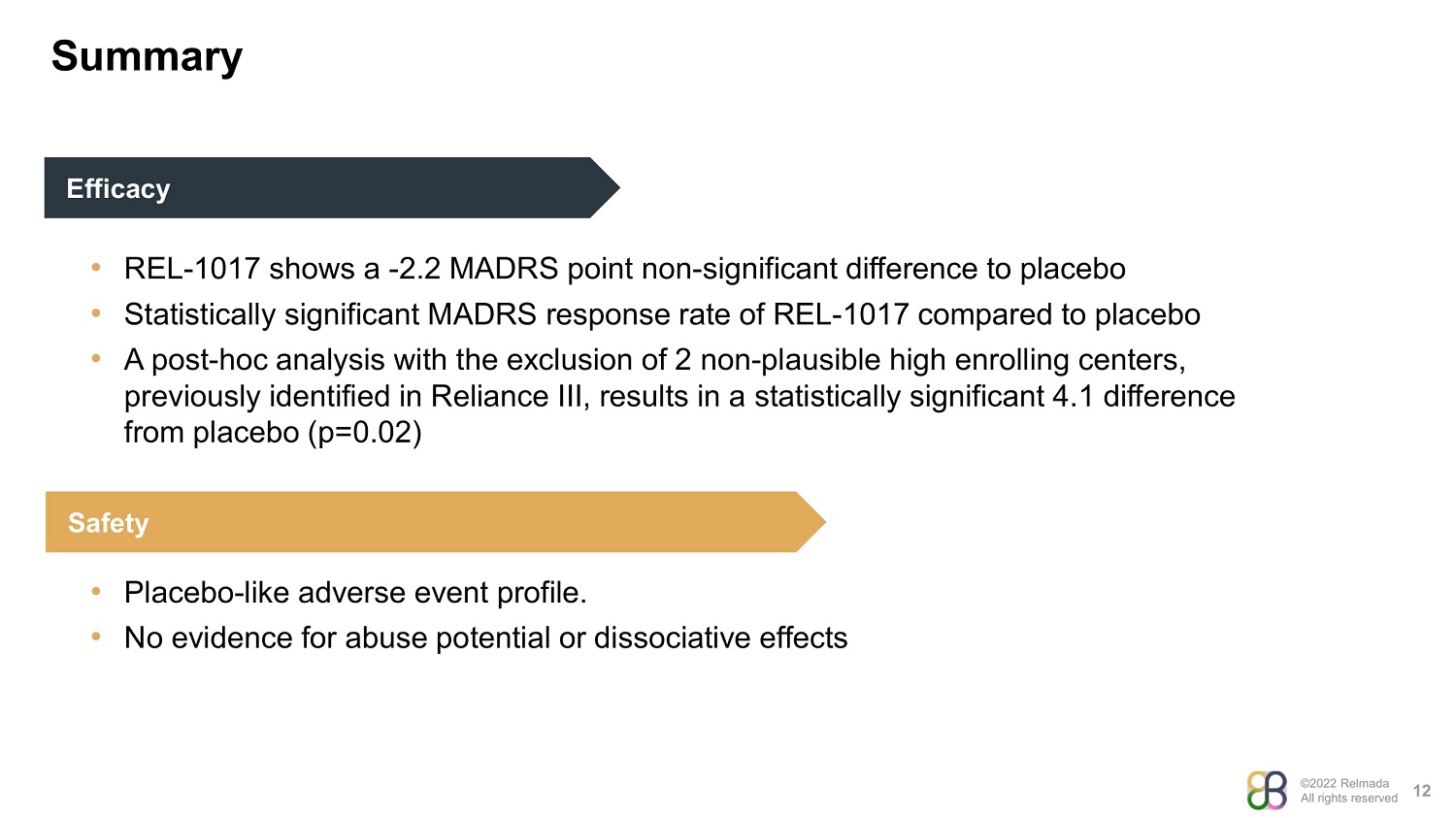 ©2022 Relmada All rights reserved Summary 12 Efficacy • REL - 1017 shows a - 2.2 MADRS point non - significant difference to placebo • Statistically significant MADRS response rate of REL - 1017 compared to placebo • A post - hoc analysis with the exclusion of 2 non - plausible high enrolling centers, previously identified in Reliance III, results in a statistically significant 4.1 difference from placebo (p=0.02) Safety • Placebo - like adverse event profile. • No evidence for abuse potential or dissociative effects