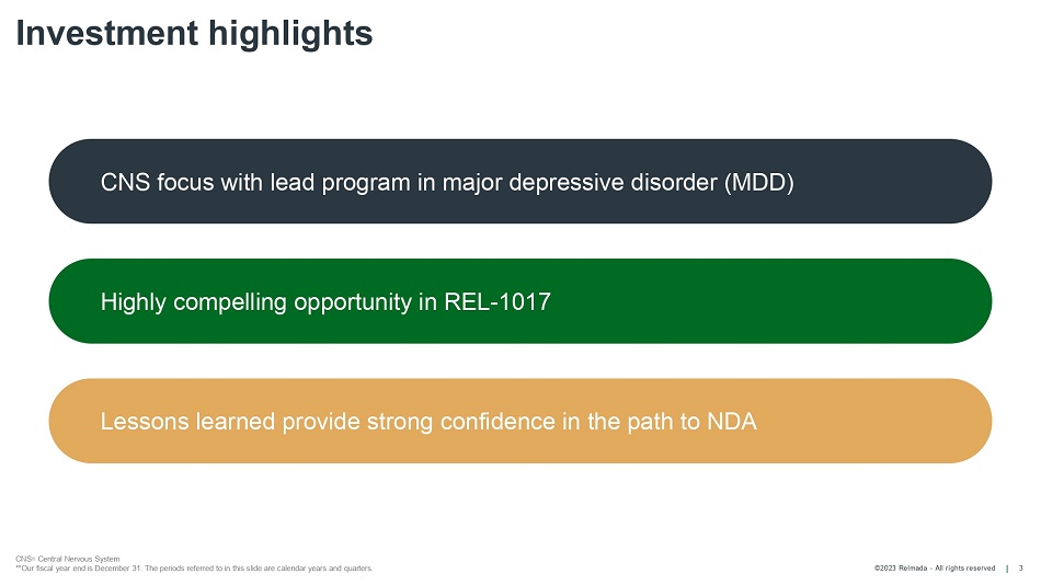 ©2023 Relmada - All rights reserved Disclosures 2 Certain statements contained in this presentation or in other documents of Relmada Therapeutics, Inc. (the “Company”), along with certain statements that may be made by management of the Company orally in presenting this material, may contain “forward - looking statements.” These statements can be identified by the fact that they do not relate strictly to historic or current facts. They use words such as “estimate,” “expect,” “intend,” “believe,” “plan,” “anticipate,” “projected” and other words and terms of similar meaning in connection with any discussion of future operating or financial performance or condition. These statements are based upon the current beliefs and expectations of the Company’s management and are subject to significant risks and uncertainties. Statements regarding future action, future performance and/or future results, those relating to the timing for completion, and results of, scheduled or additional clinical trials and the FDA’s or other regulatory review and/or approval and commercial launch and sales results (if any) of the Company’s formulations and products and regulatory filings related to the same may differ from those set forth in the forward - looking statements. Peak sales and market size estimates have been determined on the basis of market research and comparable product analysis, but no assurances can be given that such sales levels will be achieved, if at all, or that such market size estimates will prove accurate. Because actual results are affected by these and other potential risks, contingencies and uncertainties, the Company cautions investors that actual results may differ materially from those expressed or implied in any forward - looking statement. It is not possible to predict or identify all such risks, contingencies and uncertainties. The Company identifies some of these factors in its Securities and Exchange Commission (“SEC”) filings on Forms 10 - K, 10 - Q and 8 - K, and investors are advised to consult the Company’s filings for a more complete listing of risk factors, contingencies and uncertainties affecting the Company and its business and financial performance. The Company assumes no obligation to update forward - looking statements as circumstances change. Investors are advised to consult further disclosures that the Company makes or has made on related subjects in the Company’s Form 10 - K, 10 - Q and 8 - K reports.