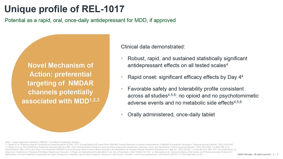 ©2023 Relmada - All rights reserved Prevalence of depression 6 ~10M Patients in the US treated for a major depressive episode in the last year 1 40% required combination Rx 2 ~19.3M Individual adults in the US had at least one major depressive episode in 2019 1 >280M People of all ages suffering from depression globally 3 Rx = prescription 1.) Substance Abuse and Mental Health Services Administration (SAMHSA), U.S. Department of Health and Human Services (HHS) 2019 National Survey on Drug Use and Health; 2.) Decision Resources Group Unipolar Depression 2020 report; 3.) WHO Depression Fact Sheet