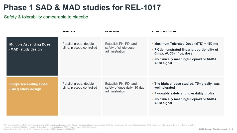 ©2023 Relmada - All rights reserved 8 REL - 1017 Phase 1 & 2 Efficacy and Safety Data