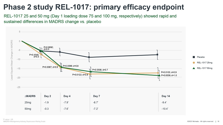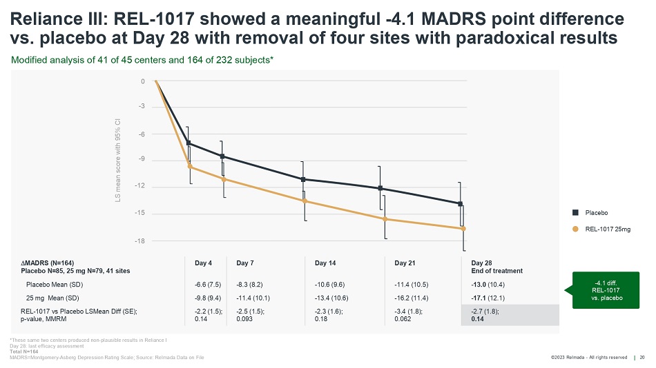 ©2023 Relmada - All rights reserved 24 Reliance I: REL - 1017 vs placebo with post - hoc removal of two sites with paradoxical results - 4.1 diff. REL - 1017 vs. placebo MADRS (N=185) Placebo N=88, 25 mg N=97, 41 sites Day 4 Day 7 Day 14 Day 21 Day 28 End of Treatment Placebo Mean (SD) - 8.5 (7.0) - 11.0 (9.6) - 11.0 (10.8) - 11.8 (10.5) - 12.6 (9.8) 25 mg Mean (SD) - 8.8 (9.1) - 10.7 (9.6) - 13.4 (9.1) - 15.3 (10.1) - 16.7 (11.1) REL - 1017 vs Placebo LSMean Diff (SE); p - value, MMRM - 1.0 (1.3); 0.45 0.1 (1.4); 0.95 - 2.6 (1.5); 0.08 - 3.3 (1.6); 0.03 - 3.7 (1.6); 0.02 *These same two centers produced non - plausible results in Reliance III Day 28: last efficacy assessment Total N=185 ; * p= <0.05 MADRS=Montgomery - Asberg Depression Rating Scale; Source: Relmada Data on File Placebo REL - 1017 25mg LS mean change from baseline in MADRS10 total score (+/ - 95% CI) - 15 Modified analysis of 41 of 43 centers and 185 of 227 subjects* 0 - 3 - 6 - 9 - 12 - 18