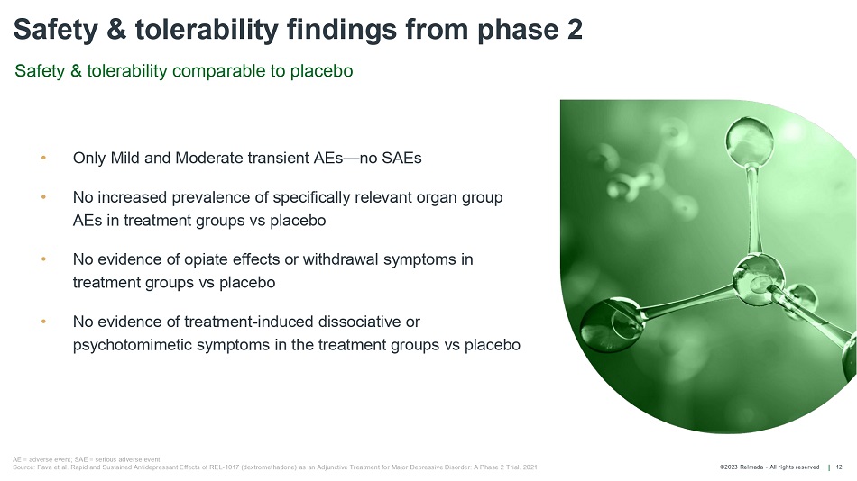 ©2023 Relmada - All rights reserved REL - 1017 phase 2 study efficacy: response & remission 11 50% 44% 20% 0% 13% 25% 38% 50% 63% PBO REL 25 mg REL 50 mg Day 14 Percent Subjects per ITT Group Percentage of subjects achieving response (≥ 50% MADRS improvement from baseline) N = 20 16 18 31% 39% 0% 10% 20% 30% 40% 5% PBO Percentage of subjects achieving remission (MADRS ≤10) Day 14 50% N= 20 REL 25 mg * 16 REL 50 mg * 18 Day 14: last efficacy assessment, 7 days after last dose of study drug * p = < .05 MADRS=Montgomery - Asberg Depression Rating Scale Source: Fava et al. Rapid and Sustained Antidepressant Effects of REL - 1017 (dextromethadone) as an Adjunctive Treatment for Major Depressive Disorder