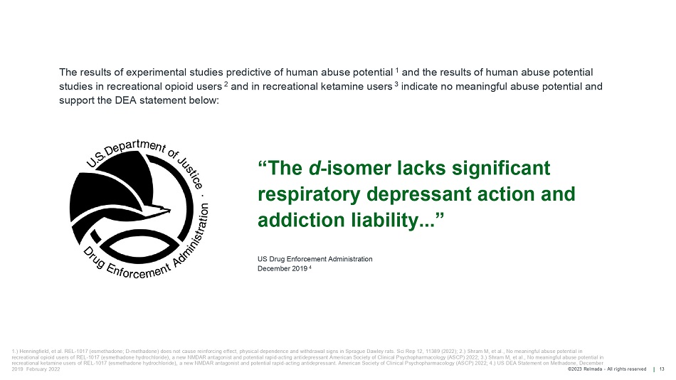 ©2023 Relmada - All rights reserved 13 “The d - isomer lacks significant respiratory depressant action and addiction liability...” US Drug Enforcement Administration December 2019 4 1.) Henningfield, et al. REL - 1017 (esmethadone; D - methadone) does not cause reinforcing effect, physical dependence and withdrawal signs in Sprague Dawley rats. Sci Rep 12, 11389 (2022); 2.) Shram M, et al., No meaningful abuse potential in recreational opioid users of REL - 1017 (esmethadone hydrochloride), a new NMDAR antagonist and potential rapid - acting antidepressant American Society of Clinical Psychopharmacology (ASCP) 2022; 3.) Shram M, et al., No meaningful abuse potential in recreational ketamine users of REL - 1017 (esmethadone hydrochloride), a new NMDAR antagonist and potential rapid - acting antidepressant. American Society of Clinical Psychopharmacology (ASCP) 2022; 4.) US DEA Statement on Methadone, December 2019 February 2022 The results of experimental studies predictive of human abuse potential 1 and the results of human abuse potential studies in recreational opioid users 2 and in recreational ketamine users 3 indicate no meaningful abuse potential and support the DEA statement below: