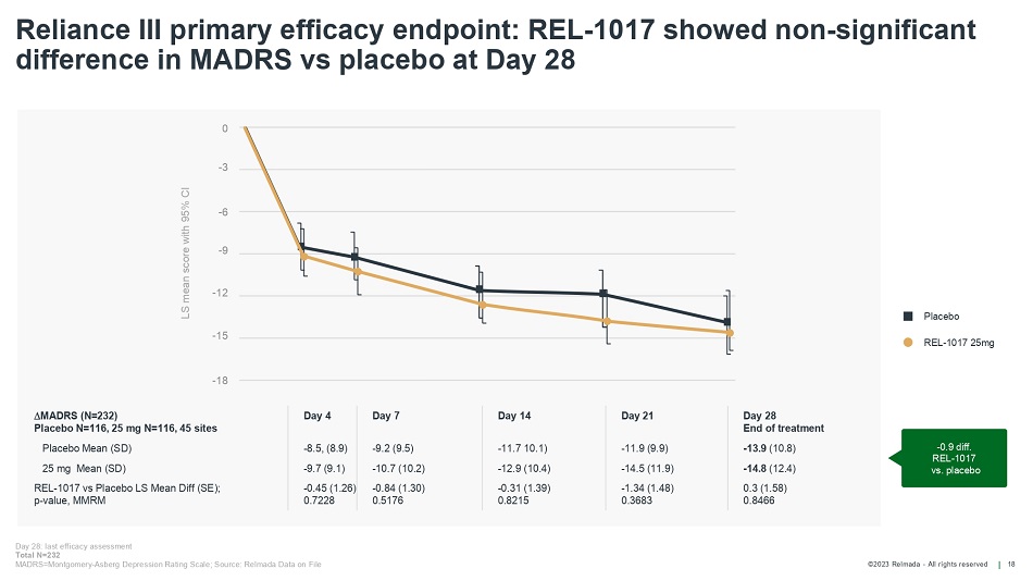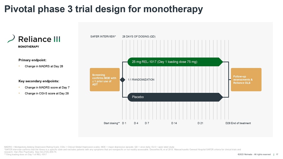 ©2023 Relmada - All rights reserved Reliance I and Reliance III results overview 16 * Center - specific factors in these top - enrolling centers yielded paradoxical results: placebo robustly outperformed REL - 1017. The top enrolling center in Reliance III had a mean placebo response of 23 MADRS points Reliance I and Reliance III did not reach primary endpoint Reliance I showed a significant 40% response rate compared to placebo (p=0.044) Reliance I and Reliance III confirmed very favorable safety and lack of abuse potential In Reliance I and Reliance III, post - hoc analyses excluding 2 - 4 common top - enrolling centers* show a positive efficacy signal