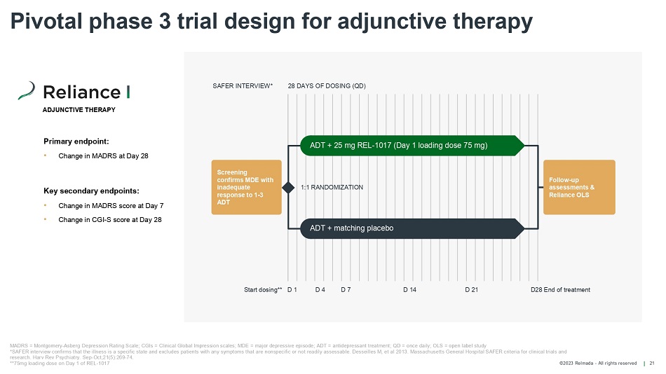 ©2023 Relmada - All rights reserved Reliance III: REL - 1017 showed a meaningful - 4.1 MADRS point difference vs. placebo at Day 28 with removal of four sites with paradoxical results 20 *These same two centers produced non - plausible results in Reliance I Day 28: last efficacy assessment Total N=164 MADRS=Montgomery - Asberg Depression Rating Scale; Source: Relmada Data on File - 4.1 diff. REL - 1017 vs. placebo MADRS (N=164) Placebo N=85, 25 mg N=79, 41 sites Day 4 Day 7 Day 14 Day 21 Day 28 End of treatment Placebo Mean (SD) - 6.6 (7.5) - 8.3 (8.2) - 10.6 (9.6) - 11.4 (10.5) - 13.0 (10.4) 25 mg Mean (SD) - 9.8 (9.4) - 11.4 (10.1) - 13.4 (10.6) - 16.2 (11.4) - 17.1 (12.1) REL - 1017 vs Placebo LSMean Diff (SE); p - value, MMRM - 2.2 (1.5); 0.14 - 2.5 (1.5); 0.093 - 2.3 (1.6); 0.18 - 3.4 (1.8); 0.062 - 2.7 (1.8); 0.14 Placebo REL - 1017 25mg LS mean score with 95% CI - 15 Modified analysis of 41 of 45 centers and 164 of 232 subjects* 0 - 3 - 6 - 9 - 12 - 18