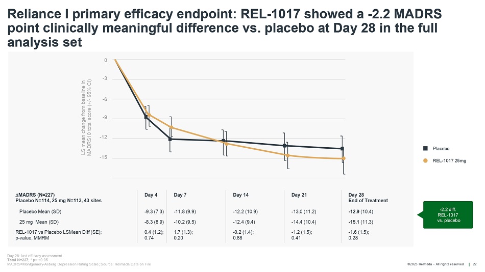 ©2023 Relmada - All rights reserved Pivotal phase 3 trial design for adjunctive therapy 21 Primary endpoint: • Change in MADRS at Day 28 Key secondary endpoints: • Change in MADRS score at Day 7 • Change in CGI - S score at Day 28 Follow - up assessments & Reliance OLS 1:1 RANDOMIZATION 28 DAYS OF DOSING (QD) D28 End of treatment ADT + 25 mg REL - 1017 (Day 1 loading dose 75 mg) ADT + matching placebo SAFER INTERVIEW* Screening confirms MDE with inadequate response to 1 - 3 ADT MADRS = Montgomery - Asberg Depression Rating Scale; CGIs = Clinical Global Impression scales; MDE = major depressive episode; ADT = antidepressant treatment; QD = once daily; OLS = open label study *SAFER interview confirms that the illness is a specific state and excludes patients with any symptoms that are nonspecific or not readily assessable. Desseilles M, et al 2013. Massachusetts General Hospital SAFER criteria for clinical trials and research. Harv Rev Psychiatry. Sep - Oct;21(5):269 - 74. **75mg loading dose on Day 1 of REL - 1017 ADJUNCTIVE THERAPY Start dosing** D 1 D 4 D 7 D 14 D 21