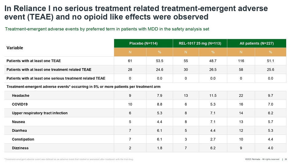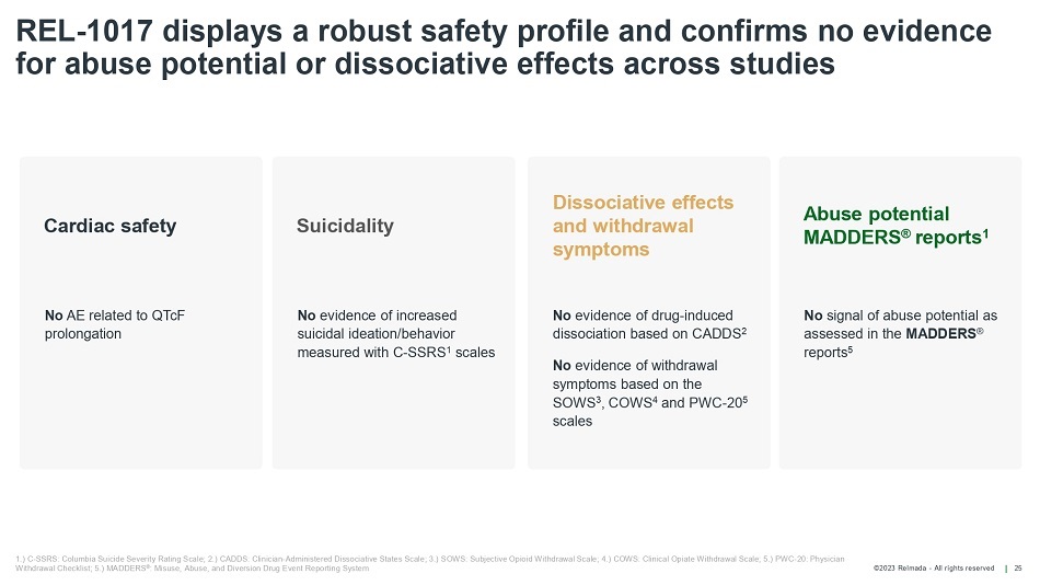 ©2023 Relmada - All rights reserved REL - 1017 displays a robust safety profile and confirms no evidence for abuse potential or dissociative effects across studies 25 1.) C - SSRS: Columbia Suicide Severity Rating Scale; 2.) CADDS: Clinician - Administered Dissociative States Scale; 3.) SOWS: Subjective Opioid Withdrawal Scale; 4.) COWS: Clinical Opiate Withdrawal Scale; 5.) PWC - 20: Physician Withdrawal Checklist; 5.) MADDERS ® : Misuse, Abuse, and Diversion Drug Event Reporting System No AE related to QTcF prolongation No evidence of increased suicidal ideation/behavior measured with C - SSRS 1 scales No evidence of drug - induced dissociation based on CADDS 2 No evidence of withdrawal symptoms based on the SOWS 3 , COWS 4 and PWC - 20 5 scales No signal of abuse potential as assessed in the MADDERS ® reports 5 Cardiac safety Suicidality Dissociative effects and withdrawal symptoms Abuse potential MADDERS ® reports 1