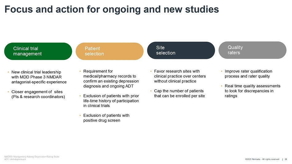 ©2023 Relmada - All rights reserved Focus and action for ongoing and new studies 28 Clinical trial management MADRS=Montgomery - Asberg Depression Rating Scale ADT =Antidepressant Patient selection Site selection • Requirement for medical/pharmacy records to confirm an existing depression diagnosis and ongoing ADT • Exclusion of patients with prior life - time history of participation in clinical trials • Exclusion of patients with positive drug screen • New clinical trial leadership with MDD Phase 3 NMDAR antagonist - specific experience • Closer engagement of sites (PIs & research coordinators) • Favor research sites with clinical practice over centers without clinical practice • Cap the number of patients that can be enrolled per site Quality raters • Improve rater qualification process and rater quality • Real time quality assessments to look for discrepancies in ratings