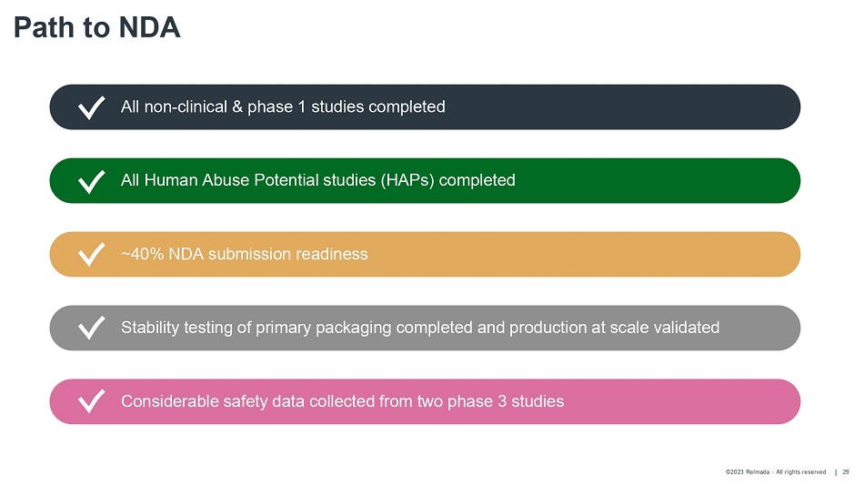 ©2023 Relmada - All rights reserved Path to NDA 29 All non - clinical & phase 1 studies completed All Human Abuse Potential studies (HAPs) completed ~40% NDA submission readiness Stability testing of primary packaging completed and production at scale validated Considerable safety data collected from two phase 3 studies