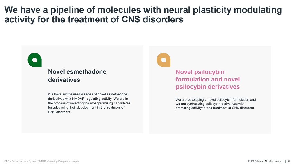 ©2023 Relmada - All rights reserved We have a pipeline of molecules with neural plasticity modulating activity for the treatment of CNS disorders 31 Novel esmethadone derivatives We have synthesized a series of novel esmethadone derivatives with NMDAR regulating activity. We are in the process of selecting the most promising candidates for advancing their development in the treatment of CNS disorders. CNS = Central Nervous System; NMDAR = N - methyl - D - aspartate receptor Novel psilocybin formulation and novel psilocybin derivatives We are developing a novel psilocybin formulation and we are synthetizing psilocybin derivatives with promising activity for the treatment of CNS disorders.
