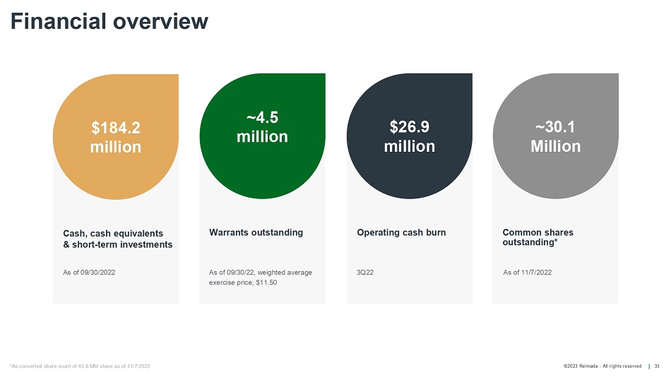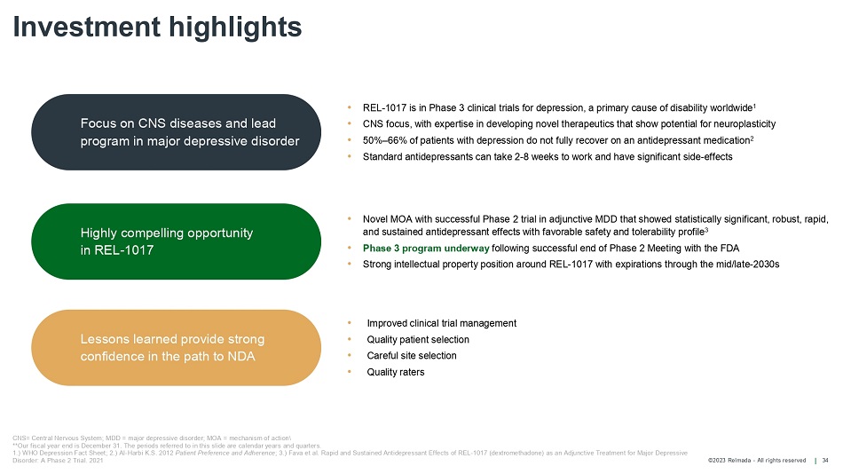 ©2023 Relmada - All rights reserved Warrants outstanding Operating cash burn Common shares outstanding* Financial overview 33 Cash, cash equivalents & short - term investments $184.2 million ~4.5 million $26.9 million ~30.1 Million As of 09/30/22, weighted average exercise price, $11.50 3Q22 As of 11/7/2022 As of 09/30/2022 *As converted share count of 43.8 MM share as of 11/7/2022