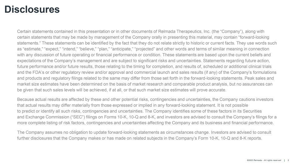 ©202 3 Relmada - All rights reserve d Disclosures 2 Certain statements contained in this presentation or in other documents of Relmada Therapeutics, Inc. (the “Company”), along with certain statements that may be made by management of the Company orally in presenting this material, may contain “forward - lookin g statements.” These statements can be identified by the fact that they do not relate strictly to historic or current facts. Th ey use words such as “estimate,” “expect,” “intend,” “believe,” “plan,” “anticipate,” “projected” and other words and terms of similar meaning in connection with any discussion of future operating or financial performance or condition. These statements are based upon the current be lie fs and expectations of the Company’s management and are subject to significant risks and uncertainties. Statements regarding future act ion, future performance and/or future results, those relating to the timing for completion, and results of, scheduled or additiona l c linical trials and the FDA’s or other regulatory review and/or approval and commercial launch and sales results (if any) of the Company’s fo rmu lations and products and regulatory filings related to the same may differ from those set forth in the forward - looking statements. Peak sales and market size estimates have been determined on the basis of market research and comparable product analysis, but no assurances ca n be given that such sales levels will be achieved , if at all, or that such market size estimates will prove accurate. Because actual results are affected by these and other potential risks, contingencies and uncertainties, the Company cautions in vestors that actual results may differ materially from those expressed or implied in any forward - looking statement. It is not possible to predict or identify all such risks, contingencies and uncertainties. The Company identifies some of these factors in its S ecu rities and Exchange Commission (“SEC”) filings on Forms 10 - K, 10 - Q and 8 - K, and investors are advised to consult the Company’s filings for a more complete listing of risk factors, contingencies and uncertainties affecting the Company and its business and financial p erf ormance. The Company assumes no obligation to update forward - looking statements as circumstances change. Investors are advised to consult further disclosures that the Company makes or has made on related subjects in the Company’s Form 10 - K, 10 - Q and 8 - K reports.