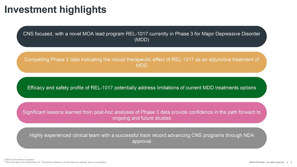 ©202 3 Relmada - All rights reserve d Investment summary 32 Focus on CNS diseases and lead program in major depressive disorder CNS= Central Nervous System; MDD = major depressive disorder; MOA = mechanism of action \ **Our fiscal year end is December 31. The periods referred to in this slide are calendar years and quarters. 1.) WHO Depression Fact Sheet; 2.) Al - Harbi K.S. 2012 Patient Preference and Adherence ; 3.) Fava et al. Rapid and Sustained Antidepressant Effects of REL - 1017 ( dextromethadone ) as an Adjunctive Treatment for Major Depressive Disorder: A Phase 2 Trial. 2021 Highly compelling opportunity in REL - 1017 Lessons learned provide strong confidence in the path to NDA • Phase 3 program underway with positive efficacy signals and safety data consistent with phase 1 and 2 studies • Novel MOA with successful Phase 2 trial in adjunctive MDD that showed statistically significant, robust, rapid, and sustained antidepressant effects with favorable safety and tolerability profile 3 • Strong intellectual property position around REL - 1017 with expirations through the mid/late - 2030s • REL - 1017 is in Phase 3 for depression, a primary cause of disability worldwide 1 • REL - 1017 potentially addresses the limitations of current MDD treatments where 50% – 66% of patients do not fully recover on an antidepressant medication 2 , take 2 - 8 weeks to work, and have significant side effects • Highly experienced clinical team with CNS focused backgrounds and a successful track record advancing programs through NDA approval • Improved clinical trial management • Quality patient selection • Careful site selection • P rotocol simplification