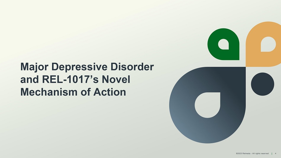 ©202 3 Relmada - All rights reserve d Highly experienced clinical team with a successful track record advancing CNS programs through NDA approval Significant lessons learned from post - hoc analyses of Phase 3 data provide confidence in the path forward to ongoing and future studies Efficacy and safety profile of REL - 1017 potentially address limitations of current MDD treatments options Compelling Phase 2 data indicating the robust therapeutic effect of REL - 1017 as an adjunctive treatment of MDD Investment highlights 3 CNS= Central Nervous System **Our fiscal year end is December 31. The periods referred to in this slide are calendar years and quarters. CNS focused, with a novel MOA lead program REL - 1017 currently in Phase 3 for Major Depressive Disorder (MDD)