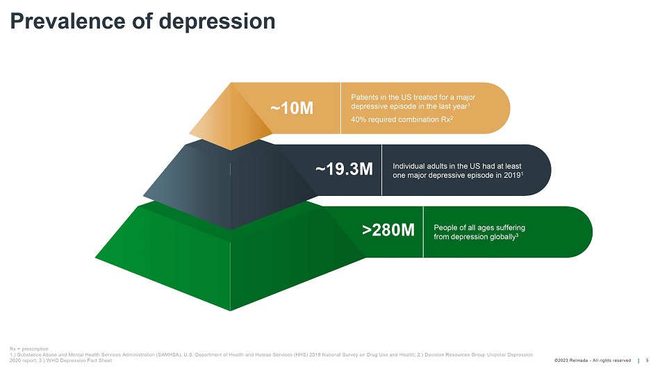 ©202 3 Relmada - All rights reserve d Prevalence of depression 5 ~10M Patients in the US treated for a major depressive episode in the last year 1 40% required combination Rx 2 ~19.3M Individual adults in the US had at least one major depressive episode in 2019 1 >280M People of all ages suffer ing from depression globally 3 Rx = prescription 1.) Substance Abuse and Mental Health Services Administration (SAMHSA), U.S. Department of Health and Human Services (HHS) 20 19 National Survey on Drug Use and Health; 2.) Decision Resources Group Unipolar Depression 2020 report; 3.) WHO Depression Fact Sheet