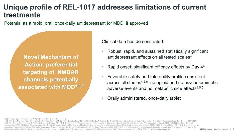 ©202 3 Relmada - All rights reserve d Limitations of current treatments for MDD 6 MDD = major depressive disorder 1.) Trivedi MH, et al. Am J Psychiatry. 2006;163:28 - 40; 2.) Ashton AK, et al. Curr Ther Res. 2005;66(2):97 - 106; 3.) US Prescribing Information, brexpiprazole , quetiapine, aripiprazole Limited efficacy Slow onset of action Safety and tolerability challenges ~65% MDD patients do not respond to first antidepressant treatment 1 Side effects of atypical antipsychotics approved as adjunctive treatments for MDD include tardive dyskinesia, metabolic syndrome, cognitive impairment and stroke 3 Standard antidepressants, even when effective, may take up to 8 weeks to reach efficacy 2