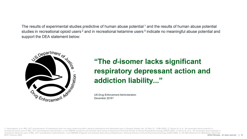 ©202 3 Relmada - All rights reserve d 10 “The d - isomer lacks significant respiratory depressant action and addiction liability...” US Drug Enforcement Administration December 2019 4 1.) Henningfield , et al. REL - 1017 ( esmethadone ; D - methadone) does not cause reinforcing effect, physical dependence and withdrawal signs in Sprague Dawley rats. Sci Rep 12, 1 1389 (2022); 2.) Shram M, et al., No meaningful abuse potential in recreational opioid users of REL - 1017 ( esmethadone hydrochloride), a new NMDAR antagonist and potential rapid - acting antidepressant American Society of Clinical Psychopharmacolog y (ASCP) 2022; 3.) Shram M, et al., No meaningful abuse potential in recreational ketamine users of REL - 1017 ( esmethadone hydrochloride), a new NMDAR antagonist and potential rapid - acting antidepressant. American Society of Clinical Psychopharmacolo gy (ASCP) 2022; 4.) US DEA Statement on Methadone, December 2019 February 2022 The results of experimental studies predictive of human abuse potential 1 and the results of human abuse potential studies in recreational opioid users 2 and in recreational ketamine users 3 indicate no meaningful abuse potential and support the DEA statement below: