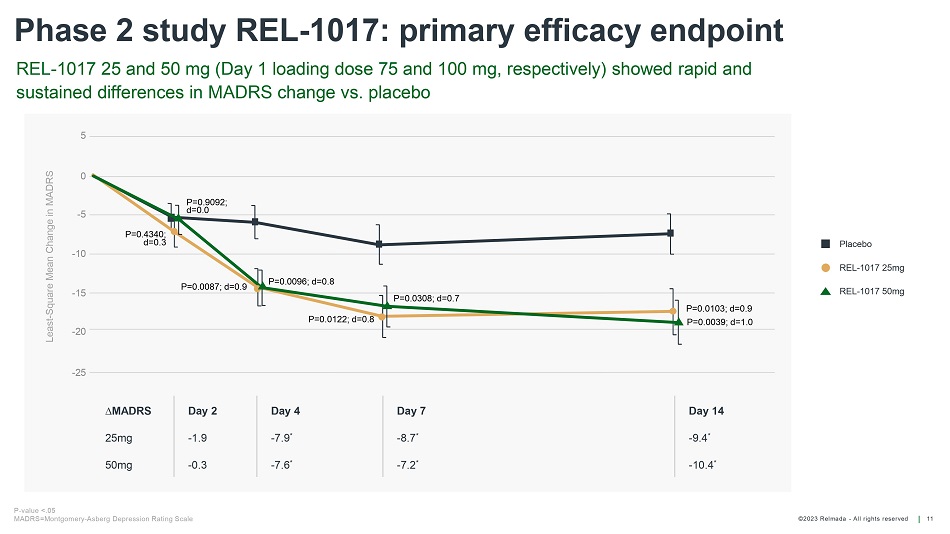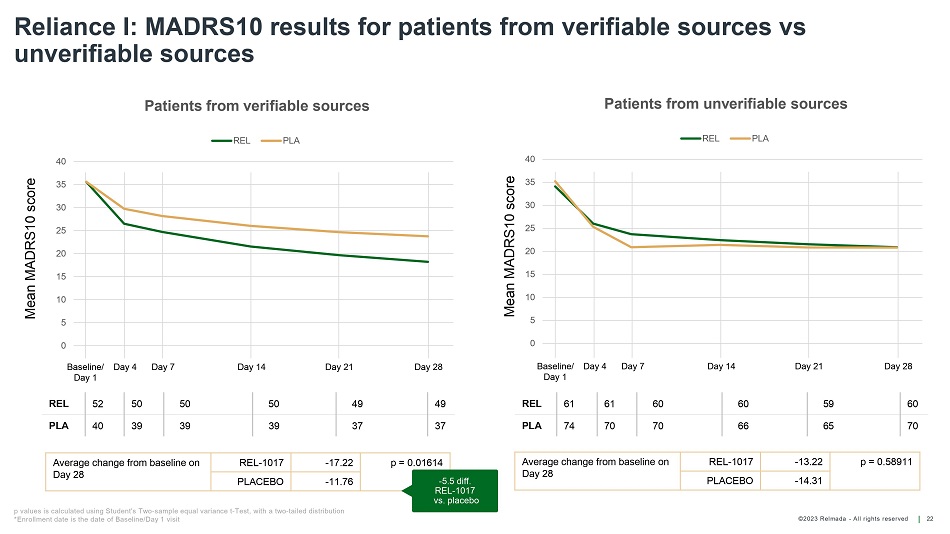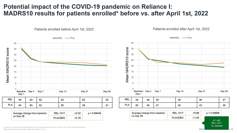 ©202 3 Relmada - All rights reserve d Baseline/ Day 1 Day 4 Day 7 Day 14 Day 21 Day 28 Reliance I: MADRS10 results for patients from verifiable sources vs unverifiable sources 22 REL 52 50 50 50 49 49 PLA 40 39 39 39 37 37 Average change from baseline on Day 28 REL - 1017 - 17.22 p = 0.01614 PLACEBO - 11.76 Average change from baseline on Day 28 REL - 1017 - 13.22 p = 0.58911 PLACEBO - 14.31 Mean MADRS10 score Mean MADRS10 score Baseline/ Day 1 Day 4 Day 7 Day 14 Day 21 Day 28 REL 61 61 60 60 59 60 PLA 74 70 70 66 65 70 p values is calculated using Student's Two - sample equal variance t - Test, with a two - tailed distribution *Enrollment date is the date of Baseline/Day 1 visit 0 5 10 15 20 25 30 35 40 Patients from verifiable sources REL PLA - 5.5 diff. REL - 1017 vs. placebo 0 5 10 15 20 25 30 35 40 Patients from unverifiable sources REL PLA