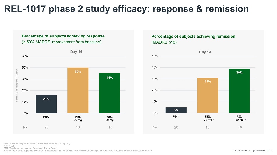 ©202 3 Relmada - All rights reserve d Phase 2 study REL - 1017: primary efficacy endpoint 11 Least - Square Mean Change in MADRS 5 0 - 5 - 25 - 10 - 15 - 20 P=0.0103; d=0.9 P=0.0039; d=1.0 P=0.0308; d=0.7 P=0.0122; d=0.8 P=0.0096; d=0.8 P=0.0087; d=0.9 P=0.9092; d=0.0 P=0.4340; d=0.3 D MADRS Day 2 Day 4 Day 7 Day 14 25mg - 1.9 - 7.9 * - 8.7 * - 9.4 * 50mg - 0.3 - 7.6 * - 7.2 * - 10.4 * Placebo REL - 1017 25mg REL - 1017 50mg REL - 1017 25 and 50 mg (Day 1 loading dose 75 and 100 mg, respectively) showed rapid and sustained differences in MADRS change vs. placebo P - value <.05 MADRS=Montgomery - Asberg Depression Rating Scale