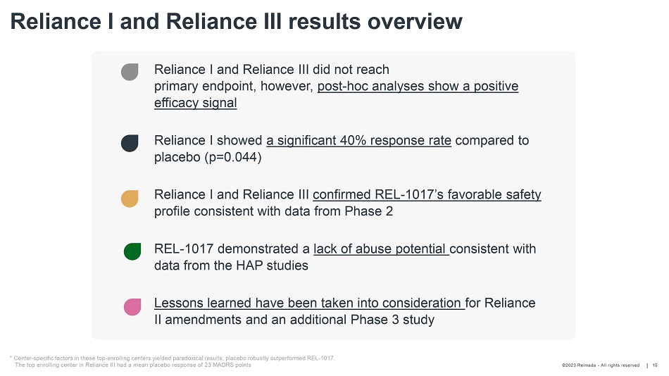 ©202 3 Relmada - All rights reserve d Randomized, two - arm, placebo - controlled pivotal study as a monotherapy treatment for patients with MDD. In patients experiencing an untreated MDE (patients receiving no ADT) Primary Endpoint: Change in MADRS at Day 28 Key Secondary Endpoints: • Change in CGI - S score at Day 28 • Change in MADRS score at Day 7 Randomized two - arm, placebo - controlled pivotal studies in patients with MDD and inadequate response to ongoing standard antidepressant treatment. These are two studies conducted one after the other. In MDD patients with inadequate response to 1 - 3 ADT in the current MDE Primary Endpoint: Change in MADRS at Day 28 Key Secondary Endpoints: • Change in CGI - S score at Day 28 • Change in MADRS score at Day 7 Long - term, open - label safety study. Patients continuing from Reliance I, II & III Patients new to REL - 1017 REL - 1017 phase 3 program for the treatment of MDD 14 MDD = major depressive disorder; ADT = antidepressant treatment ; OLS = open label study; MADRS = Montgomery - Asberg Depression Rating Scale; CGIs = Clinical Global Impression scales; MDE = major depressive episode Additional phase 3 adjunctive MDD trial Trial design in preparation with consideration of the lessons learned from Reliance I and III +