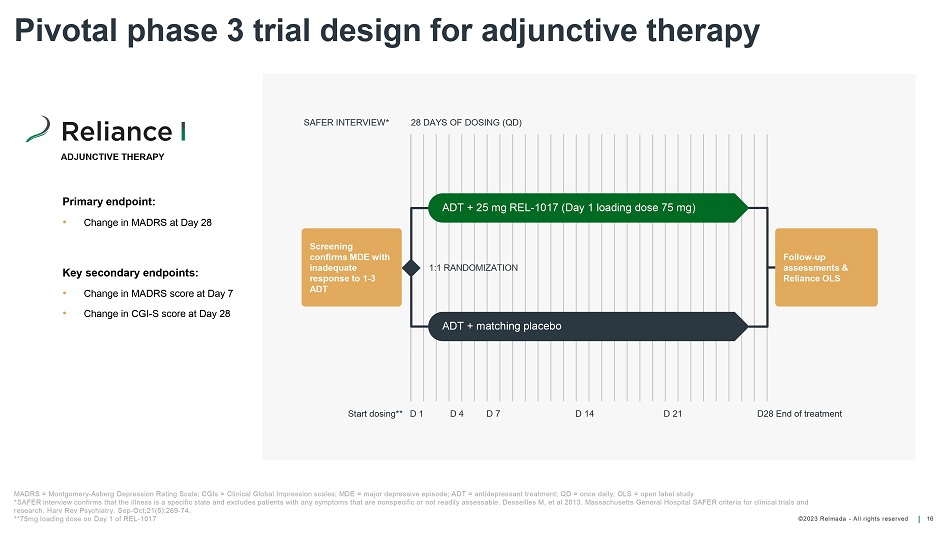 ©202 3 Relmada - All rights reserve d Reliance I and Reliance III results overview 15 * Center - specific factors in these top - enrolling centers yielded paradoxical results: placebo robustly outperformed REL - 1017. The top enrolling center in Reliance III had a mean placebo response of 23 MADRS points Reliance I and Reliance III did not reach primary endpoint, however, post - hoc analyses show a positive efficacy signal Reliance I showed a significant 40% response rate compared to placebo (p=0.044) Reliance I and Reliance III confirmed REL - 1017’s favorable safety profile consistent with data fro m Phase 2 REL - 1017 demonstrated a lack of abuse potential consistent with data from the HAP studies Lessons learned have been taken into consideration for Reliance II amendments and an additional Phase 3 study
