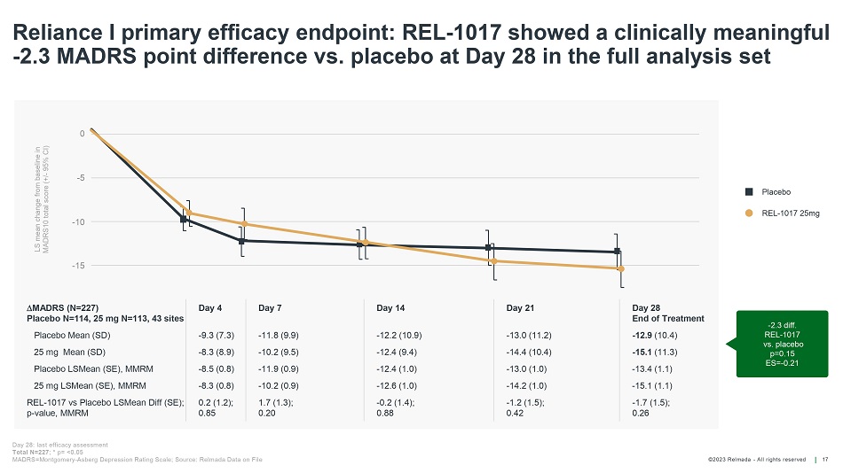 ©202 3 Relmada - All rights reserve d Pivotal phase 3 trial design for adjunctive therapy 16 Primary endpoint: • Change in MADRS at Day 28 Key secondary endpoints: • Change in MADRS score at Day 7 • Change in CGI - S score at Day 28 Follow - up assessments & Reliance OLS 1:1 RANDOMIZATION 28 DAYS OF DOSING (QD) D28 End of t reatment ADT + 25 mg REL - 1017 (Day 1 loading dose 75 mg) ADT + matching placebo SAFER INTERVIEW* Screening confirms MDE with inadequate response to 1 - 3 ADT MADRS = Montgomery - Asberg Depression Rating Scale; CGIs = Clinical Global Impression scales; MDE = major depressive episode; ADT = antidepressant treat me nt; QD = once daily; OLS = open label study *SAFER interview confirms that the illness is a specific state and excludes patients with any symptoms that are nonspecific o r n ot readily assessable. Desseilles M, et al 2013. Massachusetts General Hospital SAFER criteria for clinical trials and research. Harv Rev Psychiatry. Sep - Oct;21(5):269 - 74. **75mg loading dose on Day 1 of REL - 1017 ADJUNCTIVE THERAPY Start dosing** D 1 D 4 D 7 D 14 D 21