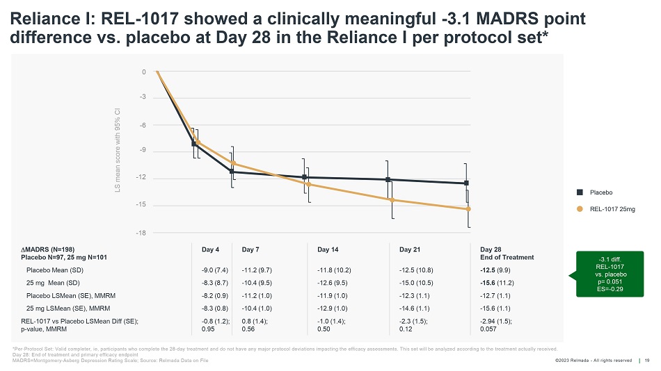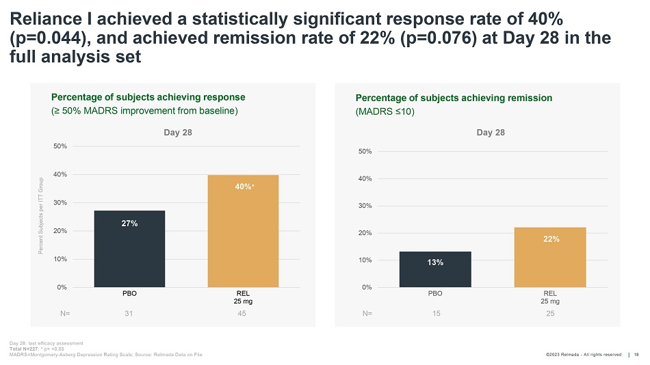 ©202 3 Relmada - All rights reserve d LS mean change from baseline in MADRS10 total score (+/ - 95% CI) 0 - 5 - 10 - 15 Reliance I primary efficacy endpoint: REL - 1017 showed a clinically meaningful - 2.3 MADRS point difference vs. placebo at Day 28 in the full analysis set 17 Day 28: last efficacy assessment Total N=227 ; * p= <0.05 MADRS=Montgomery - Asberg Depression Rating Scale; Source: Relmada Data on File Placebo REL - 1017 25mg - 2.3 diff. REL - 1017 vs. placebo p=0.15 ES= - 0.21 MADRS (N=227) Placebo N=114, 25 mg N=113, 43 sites Day 4 Day 7 Day 14 Day 21 Day 28 End of Treatment Placebo Mean (SD) - 9.3 (7.3) - 11.8 (9.9) - 12.2 (10.9) - 13.0 (11.2) - 12.9 (10.4) 25 mg Mean (SD) - 8.3 (8.9) - 10.2 (9.5) - 12.4 (9.4) - 14.4 (10.4) - 15.1 (11.3) Placebo LSMean (SE), MMRM - 8.5 (0.8) - 11.9 (0.9) - 12.4 (1.0) - 13.0 (1.0) - 13.4 (1.1) 25 mg LSMean (SE), MMRM - 8.3 (0.8) - 10.2 (0.9) - 12.6 (1.0) - 14.2 (1.0) - 15.1 (1.1) REL - 1017 vs Placebo LSMean Diff (SE); p - value, MMRM 0.2 (1.2); 0.85 1.7 (1.3); 0.20 - 0.2 (1.4); 0.88 - 1.2 (1.5); 0.42 - 1.7 (1.5); 0.26