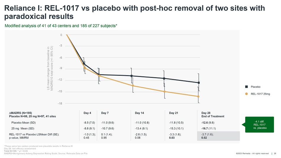 ©202 3 Relmada - All rights reserve d Reliance I: REL - 1017 showed a clinically meaningful - 3.1 MADRS point difference vs. placebo at Day 28 in the Reliance I per protocol set* 19 - 3.1 diff. REL - 1017 vs. placebo p= 0.051 ES= - 0.29 LS mean score with 95% CI Placebo REL - 1017 25mg *Per - Protocol Set: Valid completer, ie , participants who complete the 28 - day treatment and do not have any major protocol deviations impacting the efficacy assessment s. This set will be analyzed according to the treatment actually received. Day 28: End of treatment and primary efficacy endpoint MADRS=Montgomery - Asberg Depression Rating Scale; Source: Relmada Data on File MADRS (N=198) Placebo N=97, 25 mg N=101 Day 4 Day 7 Day 14 Day 21 Day 28 End of Treatment Placebo Mean (SD) - 9.0 (7.4) - 11.2 (9.7) - 11.8 (10.2) - 12.5 (10.8) - 12.5 (9.9) 25 mg Mean (SD) - 8.3 (8.7) - 10.4 (9.5) - 12.6 (9.5) - 15.0 (10.5) - 15.6 (11.2) Placebo LSMean (SE), MMRM - 8.2 (0.9) - 11.2 (1.0) - 11.9 (1.0) - 12.3 (1.1) - 12.7 (1.1) 25 mg LSMean (SE), MMRM - 8.3 (0.8) - 10.4 (1.0) - 12.9 (1.0) - 14.6 (1.1) - 15.6 (1.1) REL - 1017 vs Placebo LSMean Diff (SE); p - value, MMRM - 0.8 (1.2); 0.95 0.8 (1.4); 0.56 - 1.0 (1.4); 0.50 - 2.3 (1.5); 0.12 - 2.94 (1.5); 0.057 0 - 3 - 15 - 6 - 9 - 12 - 1 8