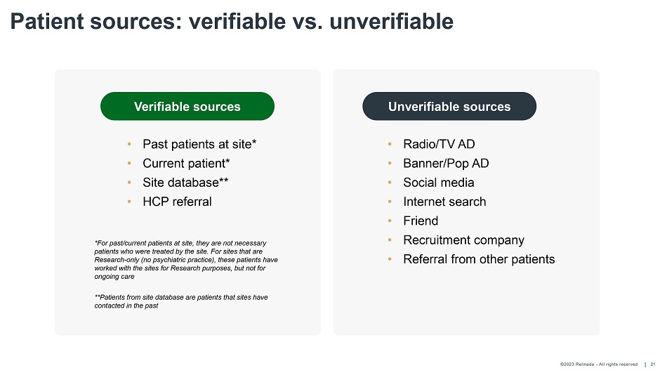 ©202 3 Relmada - All rights reserve d Patient sources: verifiable vs. unverifiable 21 Verifiable sources • Past patients at site* • Current patient* • Site database** • HCP referral • Radio/TV AD • Banner/Pop AD • Social media • Internet search • Friend • Recruitment company • Referral from other patients *For past/current patients at site, they are not necessary patients who were treated by the site. For sites that are Research - only (no psychiatric practice), these patients have worked with the sites for Research purposes, but not for ongoing care **Patients from site database are patients that sites have contacted in the past Unverifiable sources