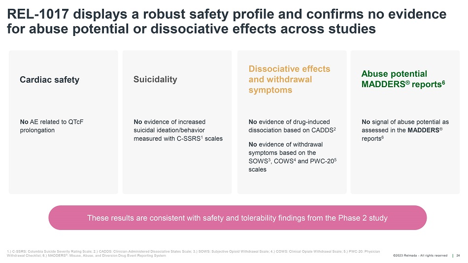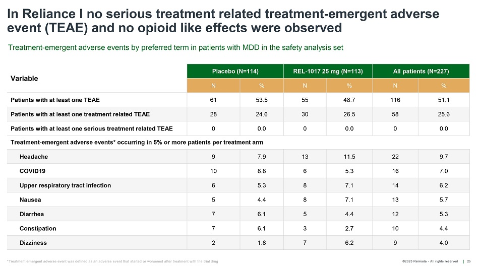 ©202 3 Relmada - All rights reserve d REL - 1017 displays a robust safety profile and confirms no evidence for abuse potential or dissociative effects across studies 24 1.) C - SSRS: Columbia Suicide Severity Rating Scale; 2.) CADDS: Clinician - Administered Dissociative States Scale; 3.) SOWS: Subje ctive Opioid Withdrawal Scale; 4.) COWS: Clinical Opiate Withdrawal Scale; 5.) PWC - 20: Physician Withdrawal Checklist; 6.) MADDERS ® : Misuse, Abuse, and Diversion Drug Event Reporting System No AE related to QTcF prolongation No evidence of increased suicidal ideation/behavior measured with C - SSRS 1 scales No evidence of drug - induced dissociation based on CADDS 2 No evidence of withdrawal symptoms based on the SOWS 3 , COWS 4 and PWC - 20 5 scales No signal of abuse potential as assessed in the MADDERS ® reports 6 Cardiac safety Suicidality Dissociative effects and withdrawal symptoms Abuse potential MADDERS ® reports 6 These results are consistent with safety and tolerability findings from the Phase 2 study