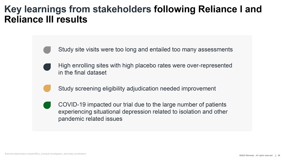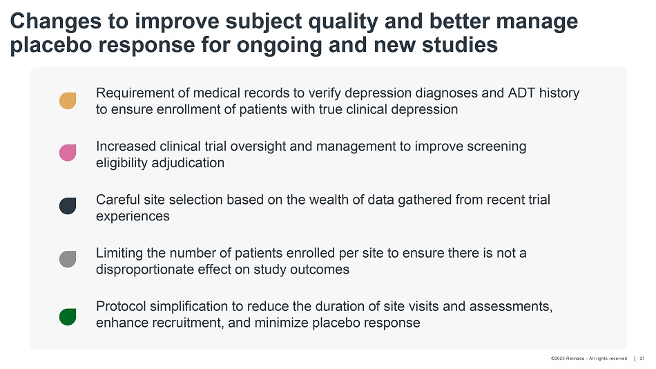 ©202 3 Relmada - All rights reserve d Key learnings from stakeholders following Reliance I and Reliance III results Study site visits were too long and entailed too many assessments High enrolling sites with high placebo rates were over - represented in the final dataset Study screening eligibility adjudication needed improvement COVID - 19 impacted our trial due to the large number of patients experiencing situational depression related to isolation and other pandemic related issues 26 External stakeholders include KOLs, principal investigators, and study coordinators
