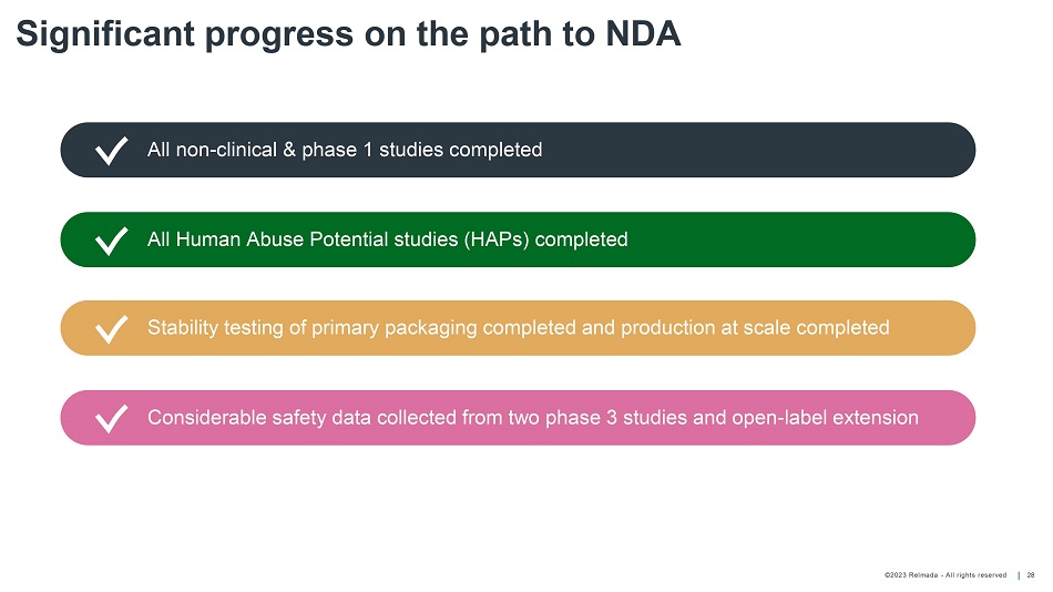 ©202 3 Relmada - All rights reserve d Significant progress on the path to NDA 28 All non - clinical & phase 1 studies completed All Human Abuse Potential studies (HAPs) completed Stability testing of primary packaging completed and production at scale completed Considerable safety data collected from two phase 3 studies and open - label extension