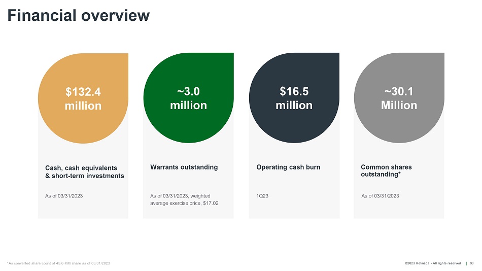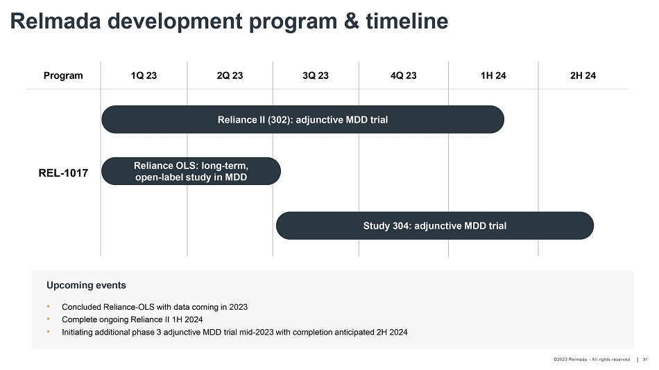©202 3 Relmada - All rights reserve d Warrants outstanding Operating cash burn Common shares outstanding* Financial overview 30 Cash, cash equivalents & short - term investments $132.4 million ~3.0 million $16.5 million ~30.1 Million As of 03/31/2023, weighted average exercise price, $17.02 1 Q23 As of 03/31/2023 As of 03/31/2023 *As converted share count of 45.6 MM share as of 03/31/2023